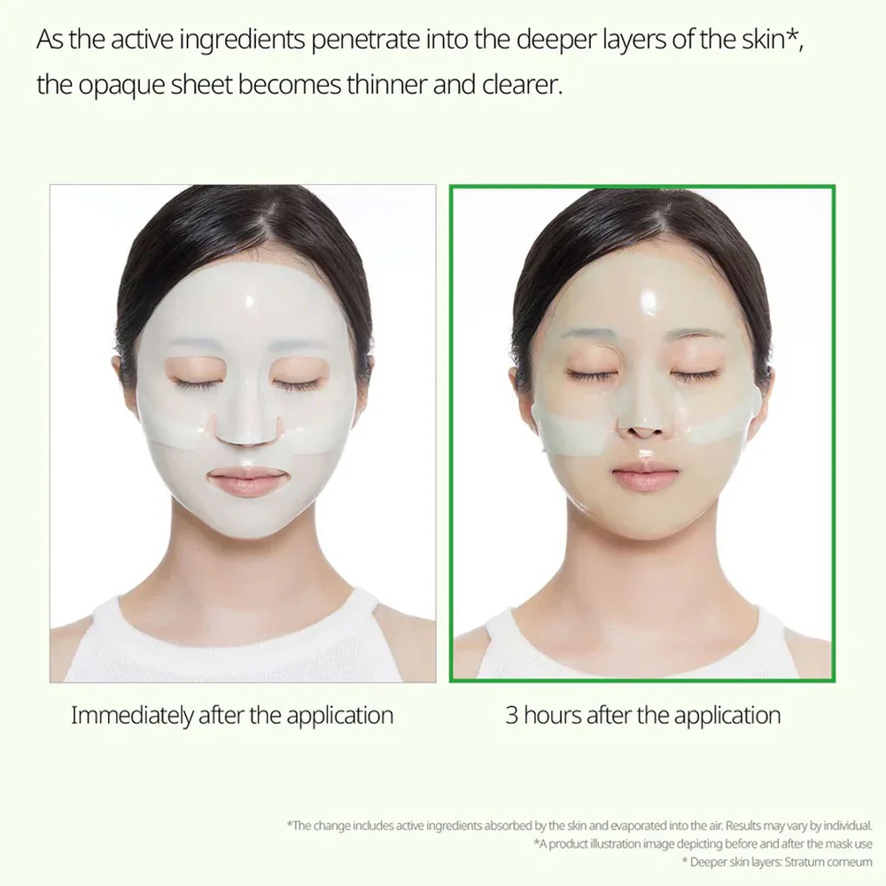 As the mask absorbs, it transforms from a solid, jelly-like sheet into a flexible, clear layer, allowing the active ingredients to deeply penetrate and revitalise the skin.